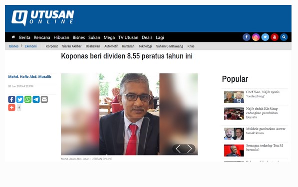 Mesyuarat Agung Perwakilan Tahunan KOPONAS yang ke-42 telah diadakan pada 26 Jun 2019.  Pengerusi KOPONAS En. Mohd Azham Abd Jabar menyatakan KOPONAS memberikan dividen sebanyak 8.55 peratus untuk tahun ini.