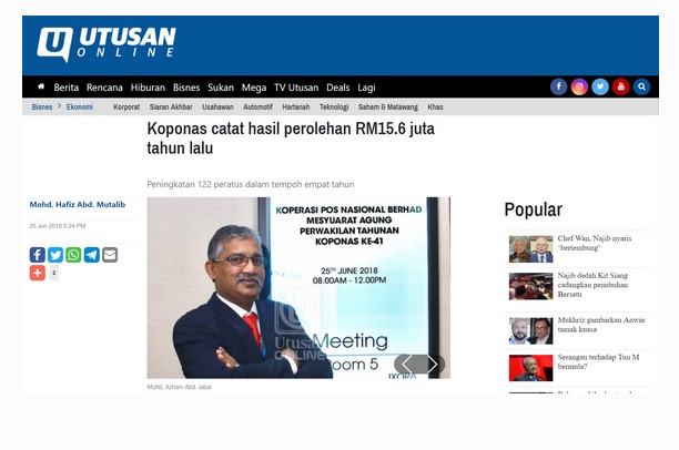 Mesyuarat Agung Perwakilan Tahunan KOPONAS yang ke-41 telah diadakan pada 25 Jun 2018. Pengerusi KOPONAS En. Mohd Azham Abd Jabar menyatakan KOPONAS mencatat hasil perolehan RM15.6 juta pada tahun lalu. Peningkatan ini adalah sebanyak 122 peratus dalam tempoh empat tahun.